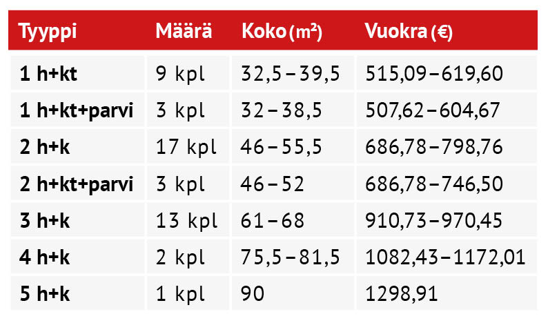 Tarjolla haettavaksi siis monipuolinen asuntovalikoima perheitä, opiskelijoita ja nuorisoa unohtamatta – kiinteistöstä löytyy kaikki tarpeellinen ja vielä hieman lisääkin – asumisen lisäarvoa tuovat aikanaan täydessä vauhdissa olevat liike-elämän palvelut rakennuksen katutasossa.